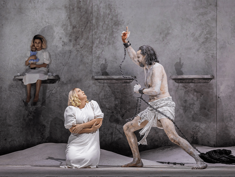 Elsa van den Heever (Salome) and Peter Mattei (John the Baptist) at the Met